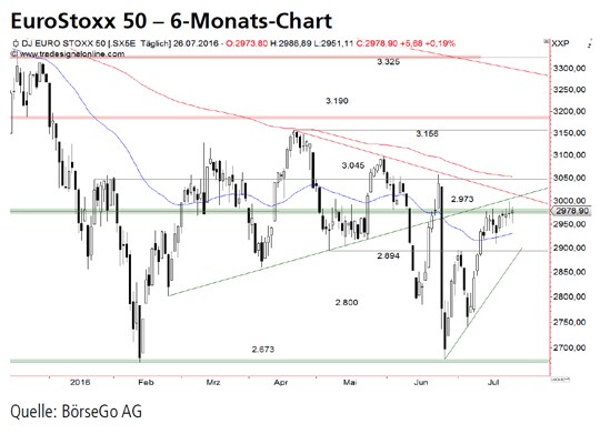 Rückblick: Der EuroStoxx 50 Index rutschte nach dem Brexit- Referendum auf die bei 2.673 Punkten liegende wichtige Unterstützungszone ab, um davon ausgehend eine Gegenbewegung zu starten.