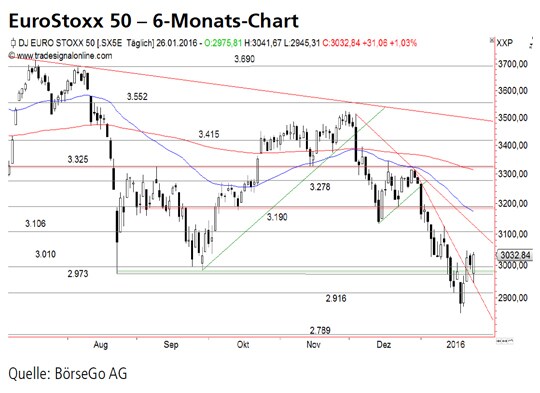 Rückblick: Der EuroStoxx 50 Index befindet sich seit Ende November in einem kurzfristigen Abwärtstrend, der zum Bruch der Unterstützung bei 3.190 Punkten und in der Folge zu einem massiven Ausverkauf bis weit unter die Tiefs des Vorjahres im Bereich von 3.000 Punkten führte.