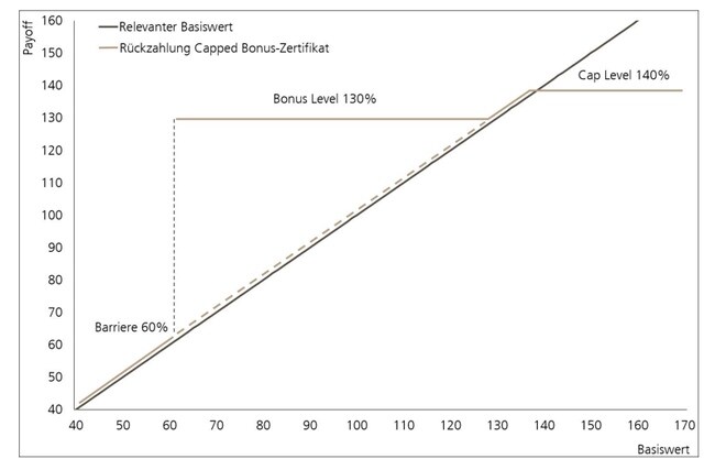 Das Bonus-Zertifikat erlaubt eine Art "Investment-Spagat". Einerseits partizipiert der Halter an steigenden Kursen. Beim Capped Bonus-Zertifikat ist dieser Mechanismus auf einen Höchstbetrag begrenzt. Zudem erhält der Anleger einen Teilschutz: Solange kein Basiswert auf oder unter eine vorab fixierte Barriere fällt, wird das Produkt mindestens zum Bonus-Level zurückbezahlt. Erst nach einer Schwellenverletzung erlischt dieser Anspruch. Im Gegenzug verzichtet der Anleger auf die Dividenden der Basiswerte. Die Ausschüttungen werden vom Emittenten für die Finanzierung von Bonus und Teilschutz verwendet.