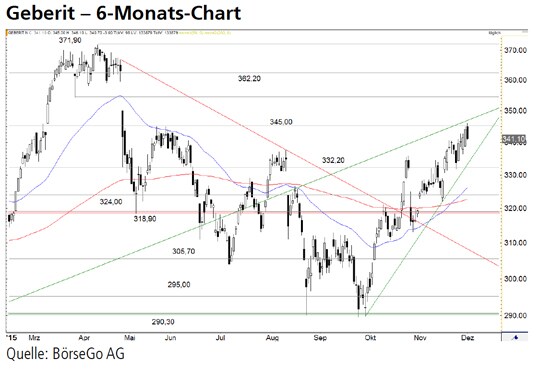 Rückblick: Die Verteidigung der Unterstützung bei 290,30 CHF bildete Ende September den Ausgangspunkt für eine steile Aufwärtsbewegung bei den Aktien von Geberit.