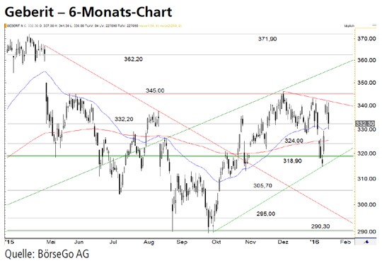 Rückblick: Ende August und Ende September 2015 versuchten die Verkäufer die Aktien von Geberit im Rahmen des mittelfristigen Abwärtstrends zweimal vergeblich unter die wichtige Unterstützung bei 290,30 CHF auszuverkaufen.