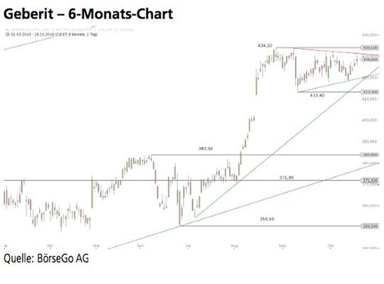 Ausblick: Die laufende Konsolidierung auf dem erhöhten Niveau entwickelt sich in Form eines symmetrischen Dreiecks, welches trendbestätigend nach oben aufgelöst werden könnte. Ein Ausbruch ist jedoch zur Generierung eines Kaufsignals nötig. Alternativ besteht die Möglichkeit, die in den vergangenen Wochen geöffnete Kurslücke zu schliessen, bevor sich die Ausbruchsbewegung mittelfristig durchsetzen kann. Die Long- Szenarien: Gelingt der Anstieg über den kurzfristigen Abwärtstrend bei derzeit 432,00 CHF, würde sich das Chartbild wieder aufhellen. Es besteht jedoch noch die Gefahr, im Bereich der 434,10 CHF-Marke zu scheitern und einen Fehlausbruch aus dem Dreieck heraus zu generieren. Wenn aber die 434,10 CHF-Marke klar durchbrochen werden kann, sind auf mittelfristige Sicht Kursgewinne bis in den Bereich der oberen langfristigen Trendbegrenzung möglich, welche derzeit bei 475,00 CHF verläuft. Die Short-Szenarien: Rutscht der Wert innerhalb des Dreiecks wieder ab, kommt es unterhalb der 420,00 CHF- Marke bereits zu einem kleinen Verkaufssignal, welches eine tiefere Konsolidierung einleiten könnte. Abgaben unter die 413,40 CHF-Marke, damit auch aus dem Aufwärtstrend seit Juli 2016, würden die Möglichkeit bieten, die offene Kurslücke im Bereich der 400,00 CHF-Marke zu schliessen.