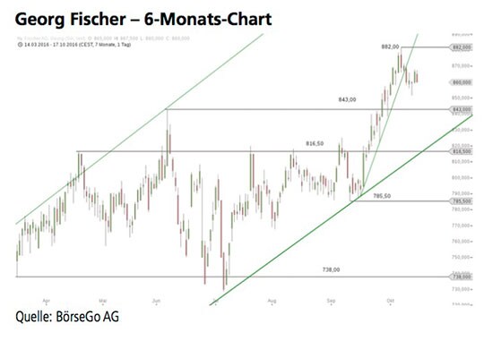 Ausblick: Mittelfristig zeigen die Aktien von Georg Fischer relative Stärke, sodass innerhalb des Aufwärtstrendkanals der vergangenen Monate noch eine Ausdehnung der Rally möglich wäre. Der gegebene kurzfristige Trendbruch leitet jedoch eine Zwischenkonsolidierung ein, welche ebenfalls noch nicht abgeschlossen sein muss. Die Long-Szenarien: Oberhalb der 843,00 CHF-Marke bietet sich bei Georg Fischer die Chance, eine kleine bullishe Flaggenformation auszubilden, welche nach oben aufgelöst werden dür e. Geht es über die 870,00 CHF-Marke wieder hinaus, könnte sich ein Anstieg bis zu den Verlaufshochs bei 882,00 CHF anschliessen. Nachdem der letzte mehrwöchige Anstieg bereits konsolidiert wurde, könnte auch ein Ausbruch über die 882,00 CHF-Marke folgen. Gelingt dies, ist innerhalb des mittelfristigen Trendkanals Spielraum bis in den Bereich der 920,00 CHF-Marke vorhanden. Die Short-Szenarien: Der Wert könnte direkt die angelaufene Konsolidierung wieder aufnehmen, um eine zweite Abwärtsphase seit den Hochs bis zur 843,00 CHF-Marke zu durchlaufen. Hier könnten die Bullen wieder im Vorteil sein. Wird die 843,00 CHF-Marke deutlicher unterschritten, bietet sich Spielraum bis in den Bereich des mittelfristigen Aufwärtstrends, welcher sich derzeit an der 816,50 CHF-Marke beendet.