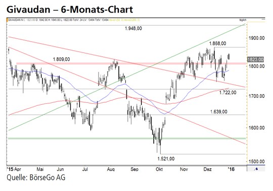 Rückblick: Ende des Jahres 2014 erreichten die Aktien von Givaudan ein neues Allzeithoch bei 1.948 CHF, ehe es im Januar zu einem massiven Einbruch bis 1.567 CHF kam.