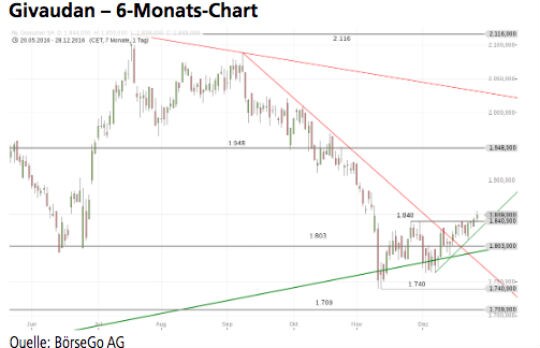 Ausblick: Die Chance ist gegeben, im Einzugsbereich des langfristigen Aufwärtstrends die Korrektur zu beenden und die Rally auch auf mittelfristige Sicht wieder aufzunehmen. Aktuell könnte sich die Erholung der Vorwochen aber auch noch als bearishe Flagge darstellen und die Basis für einen nachhaltigen Bruch des langfristigen Trends bieten. Die Long- Szenarien: Nach dem Überwinden der 1.840 CHF-Marke ist die Chance gegeben, die Erholung wieder bis zur alten Wi- derstandszone bei 1.948 CHF auszudehnen. Hier könnte ein Rücksetzer anstehen. Geht es anschliessend über die 1.948 CHF-Marke hinaus, werden Kursgewinne bis zum flachen Abwärtstrend möglich, welcher derzeit bei 2.030 CHF ver - läuft. Übergeordnet könnte die Rally dann auch wieder bis zu den Hochs bei 2.116 CHF ausgedehnt werden. Die Short- Szenarien: Sollte Givaudan wieder unter die 1.840 CHF-Marke rutschen, besteht die Gefahr, den derzeit bei 1.825 CHF lie- genden Aufwärtstrend zu durchbrechen. Dies wäre kurzfristig bearish zu bewerten und könnte eine weitere Abwärtswelle in Richtung der 1.740 CHF-Marke einleiten. Da es in diesem Fall auch deutlicher unter den langfristigen Aufwärtstrend gehen würde, könnte eine grössere Abwärtsbewegung folgen. Die 1.709 CHF-Marke dürfte in diesem Fall noch einmal Unterstüt - zung bieten. Darunter wird der Weg jedoch bis in den Bereich der 1.521 CHF-Marke relativ frei.