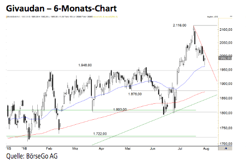 Das mit dem Ausbruch über die 1.948,00 CHF-Marke generierte Kaufsignal ist aktiv, sodass noch ein stärkerer Anstieg möglich bleibt. Die angelaufene Konsolidierung der vergangenen Wochen gefährdet dieses Szenario bisher nicht. Die Long-Szenarien: Es bietet sich die Chance, die Konsolidierung oberhalb der 1.948,00 CHF-Marke zu beenden, um den vorangegangenen Kursausbruch zu bestätigen. Wenn es den Aktien von Givaudan gelingt, den Abwärtstrend der Vorwochen zu verlassen, oberhalb der 2.040,00 CHF-Marke, wäre ein kleines Kaufsignal aktiviert. In diesem Fall könnte ein schneller Anstieg bis zur Barriere bei 2.116,00 CHF anstehen. Mittelfristig würde jedoch die bestätigte Ausbruchsbewegung für Kursgewinne oberhalb der 2.116,00 CHF-Marke sprechen, was die Notierungen auch bis zur 2.250,00 CHF-Marke führen könnte. Die Short-Szenarien: Sollte der Wert nochmals unter die 1.948,00 CHF-Marke rutschen, würde dies die Ausbruchsbewegung infrage stellen. In diesem Fall könnte eine Korrektur bis zur 1.876,00 CHF-Marke folgen. Der sich diesem Niveau nähernde Aufwärtstrend wirkt zusätzlich unterstützend, so- dass die Rally davon ausgehend fortgesetzt werden könnte. Kritischer würde es unterhalb der 1.803,00 CHF-Marke werden. Ein Rückfall unter diese Unterstützung könnte eine Verkaufswelle bis zur 1.722,00 CHF-Marke und mittelfristig bis zur 1.567,00 CHF-Marke nach sich ziehen.