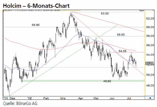 Ausblick: Der Käuferseite muss nach unserer Auffassung eine Verteidigung der 51,43 CHF-Marke gelingen, um die Erholungstendenz der letzten Tage zu einem erfolgreichen Abschluss zu bringen. Die Long-Szenarien: Verbleibt der Wert über 51,43 CHF, könnte es zu einem weiteren Anstieg bis 54,55 CHF kommen. Würde diese Marke nachhaltig durchbrochen, wäre ein kurzfristiges Kaufsignal aktiv, welches man entsprechend mit einem Longengagement handeln könnte. In der Folge dürften die Aktien von Holcim auf kurze Sicht bis 58,00 CHF haussieren. Sollte nach einer Zwischenkorrektur auch diese Hürde überwunden werden, stünde eine Fortsetzung der Aufwärtsbewegung bis 59,95 CHF und darüber bis 63,50 CHF an. Die Short-Szenarien: Eine merkliche Eintrübung des Chartbildes würde sich dagegen ergeben, sollte der Wert auf Tagesschlusskursbasis unter 51,43 CHF abfallen. Aus unserer Sicht wäre damit die Erholungsphase beendet und zunächst ein Rücksetzer bis 48,60 CHF wahrscheinlich. Wird diese wichtige Unterstützung ebenfalls durchbrochen, wäre bereits ein mittelfristiges Verkaufssignal generiert. Dies würde für die Fortsetzung des Abwärtstrends seit März sprechen und könnte einen Ausverkauf bis 46,16 CHF nach sich ziehen.
