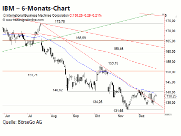 Die Long-Szenarien: Steigt der Wert in den kommenden Tagen über die Hürde bei 140,62 USD an, könnte dies den Startschuss für einen Befreiungsschlag der Käuferseite bilden. In der Folge dieses Ausbruchs käme es zu einer Aufwärtsbewegung bis an den Widerstand bei 151,71 USD. Dort könnte eine weitere Korrektur einsetzen. Steigt der Wert jedoch über die Marke und anschliessend auch über die Barriere bei 153,15 USD an, wäre ein weitreichendes Kaufsignal aktiv. In diesem Fall dürften die Aktien von IBM zunächst bis 159,46 USD und auf mittlere Sicht bis an die Widerstandsmarke bei 165,59 USD haussieren.