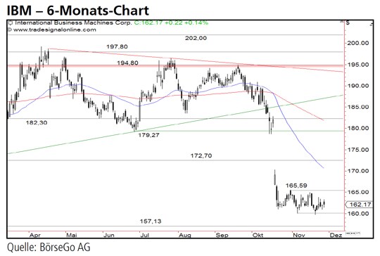 Ausblick: Die Aktien von IBM haben einen dramatischen Ausverkauf hinter sich. Ein Ende der Baisse ist trotz der aktuellen Stabilisierungstendenz nicht absehbar. Die Short-Szenarien: Die kurzfristige Seitwärtsphase würde bereits bei einem Bruch der Unterstützung bei 160,05 USD beendet werden. In diesem Fall käme es zu einer Fortsetzung der Abwärtsbewegung bis 157,13 USD. Diese Marke dürfte den Bären jedoch nur kurzzeitig Einhalt gebieten. Darunter würde sich die Verkaufswelle mit unverminderter Abwärtsdynamik bis 151,71 USD ausdehnen, ehe es auf diesem Niveau zu einer leichten Gegenbewegung kommen könnte. Sollte diese Unterstützung ebenfalls durchbrochen werden, dürfte die Baisse weiter bis 145,00 USD führen. Die Long-Szenarien: Erst ein nachhaltiger Ausbruch über den Widerstand bei 165,59 USD würde die Aktien von IBM derzeit aus dem Seitwärtsmarkt herausführen und eine erste Erholung bis 170,00 USD auslösen. An dieser Stelle könnte jedoch bereits die nächste Verkaufswelle einsetzen und den Wert auf neue Jahrestiefs führen. Ein Anstieg über die ehemalige Unterstützung bei 172,70 USD wäre dagegen bullish zu werten und könnte Zugewinne bis 179,27 USD nach sich ziehen.