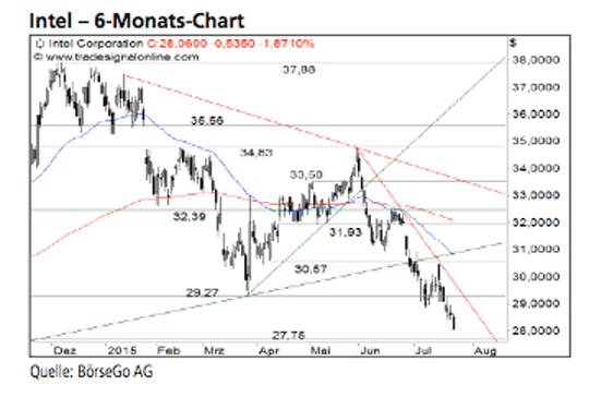 Die Aktien von Intel befinden sich nach einer Trendwende im Bereich von 38,00 USD in einer mittelfristigen Abwärtsbewegung, die sie zunächst bis März 2015 an die Unterstützung bei 29,27 USD einbrechen liess.
