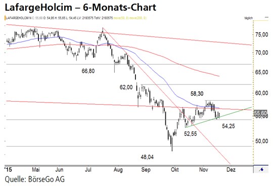 Rückblick: Mitte August dieses Jahres beschleunigte sich derohnehin schon steile Abwärtstrend der Aktien von LafargeHolcimnach dem Bruch der Unterstützung bei 64,90 CHF zusätzlich.