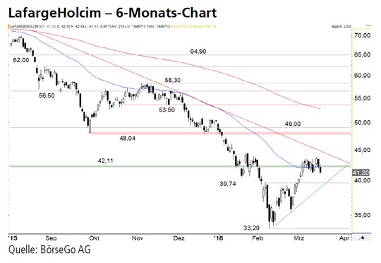 Ausblick: Die Aktien von LafargeHolcim befinden sich übergeordnet weiter in einem starken Abwärtstrend. Auf Sicht der kommenden Wochen könnten die Bullen jedoch weiter am Drücker bleiben. Die Long-Szenarien: Kurzfristig könnte der Wert nochmals an die Unterstützung bei 39,74 CHF zurücklaufen, um von dort aus einen weiteren Ausbruchsversuch über die 42,11 CHF-Marke zu starten. Sollte es den Bullen gelingen, diese Barriere und anschliessend auch das Zwischenhoch bei 43,75 CHF zu überwinden, wäre ein Kaufsignal aktiv. Anschliessend dürfte der Wert zügig über die langfristige Abwärtstrendlinie und an den Widerstand bei 48,04 CHF haussieren. Auf diesem Niveau wäre allerdings mit einem Abebben der Kaufwelle zu rechnen. Wird diese Marke dennoch überschritten, könnten die Aktien sogar bis 53,50 CHF steigen. Die Short-Szenarien: Bricht der Wert dagegen unter die Haltemarke bei 39,74 CHF ein, wäre auch die kurzfristige Aufwärtstrendlinie unterschritten. In der Folge käme es zu Abgaben bis 36,50 CHF. Dort hätten die Bullen nochmals die Chance, die Erholung fortzuführen. Kurse unterhalb der Marke würden dagegen für einen Ausverkauf bis 33,29 CHF sprechen.