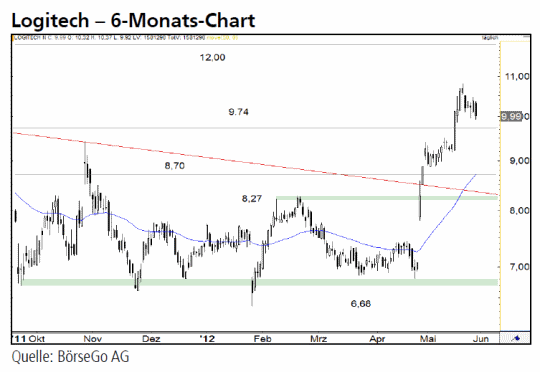 Ausblick: Kurzfristig erscheinen die Aktien von Logitech überkauft und reif für eine leichte Gegenbewegung. Dennoch überwiegen mittlerweile die Vorteile für die Käufer. Die Long- Szenarien: Nach einem Rücklauf an die ehemalige Barriere bei 9,74 CHF sollte sich der Aufwärtstrend des Wertes fortsetzen und bei einem Anstieg über das aktuelle Rallyhoch bei 10,81 CHF direkt bis 12,00 CHF führen können. Wird auch diese Marke überschritten, sind weitere Zugewinne bis 14,12 CHF wahrscheinlich. Erst auf diesem Niveau wäre mit einer mittelfristigen Korrektur zu rechnen. Die Short-Szenarien: Sollten die Aktien dagegen unter die Unterstützung bei 9,74 CHF zurücksetzen, würde dies zu einer kurzzeitigen Unterbrechung der Kaufwelle führen. In diesem Fall wäre ein Rückfall auf die 8,70 CHF-Marke zu erwarten. Von dort könnte sich der Aufwärtstrend der letzten Wochen aus unserer Sicht jedoch problemlos fortsetzen. Erst ein Bruch dieser Marke würde das Kaufsignal vom 26.04. in Frage stellen.