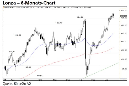 Rückblick: Die Aktien von Lonza befinden sich seit dem Anstieg über eine mittelfristige Aufwärtstrendlinie im Januar 2013 in einer übergeordneten Aufwärtsbewegung, die den Wert an den langfristigen Widerstand bei 120,80 CHF geführt hatte.