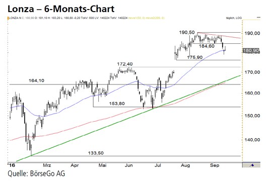 Ausblick: Die oberhalb der 184,60 CHF-Marke ausgebildete kleine Trendwendeformation birgt die Gefahr, nochmals deutlicher zurückzufallen und die Rally stärker zu korrigieren. Übergeordnet ist jedoch der mittelfristige Trend nach oben gerichtet und ungefährdet, was die Käuferseite bald wieder beflügeln könnte. Die Short-Szenarien: Nach Ausbildung einer kleinen Trendwendeformation oberhalb der 184,60 CHF-Marke kann ein weiterer Rückfall bis zur 175,90 CHF-Marke direkt folgen. Hier bietet sich die Möglichkeit einer Gegenbewegung. Wird aber auch die 175,90 CHF-Marke unterschritten, kann dies einen vollständigen Schluss der noch offenen Kurslücke nach sich ziehen, sodass auch die 170,00 CHF-Marke wieder erreicht werden könnte. Spätestens im Bereich des bei 166,00 CHF derzeit liegenden Aufwärtstrends könnte die Käuferseite wieder im Vorteil sein. Abgaben unter die 164,10 CHF-Marke könnten den Weg mittelfristig bis zur 153,80 CHF-Marke öffnen. Die Long-Szenarien: Bereits im Bereich der 175,90 CHFMarke bietet sich die Chance, die Konsolidierung zu beenden. Sofern es über die Barriere bei 184,60 CHF hinausgeht, wird ein kleines Kaufsignal in Richtung der Rekordhochs bei 190,50 CHF etabliert. Oberhalb dieses Niveaus würde sich für die Bullen die Chance bieten, die Oberkante des langfristigen Trendkanals bei derzeit 208,00 CHF zu erreichen.