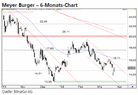 Ausblick: Der Abwärtstrend der Aktien ist weiterhin intakt. Dennoch besteht nach unserer Auffassung bei 13,05 CHF die Chance auf eine mittelfristige Bodenbildung. Die Long- Szenarien: Sollte es den Käufern gelingen, die wichtigen Unterstützungen bei 14,51 und 13,05 CHF zu verteidigen, könnte eine Erholung bis zum Widerstand bei 16,11 CHF einsetzen. Allerdings wäre erst ein Ausbruch über diese Barriere kurzfristig bullish zu werten und könnte entsprechend „long“ gehandelt werden. In der Folge hätten die Aktien weiteres Erholungspotential bis 17,60 CHF. Oberhalb dieser Marke wäre bereits der Widerstand bei 20,11 CHF erreichbar. Dort würden sich erste Gewinnmitnahmen anbieten, da es aus unserer Sicht derzeit wenig wahrscheinlich ist, dass diese Hürde überwunden werden kann. Die Short-Szenarien: Fallen die Aktien von Meyer Burger hingegen auch unter die entscheidende Unterstützung bei 13,05 CHF zurück, wäre ein langfristiges Verkaufssignal aktiviert. Zunächst dürfte der Wert bis 12,25 CHF und darunter auf mittlere Sicht bereits bis 11,25 CHF zurücksetzen. Ein langfristiger Rückfall an das Tief aus dem Jahr 2009 bei 6,31 CHF könnte bei einem Unterschreiten dieser Unterstützung jedoch ebensowenig ausgeschlossen werden.