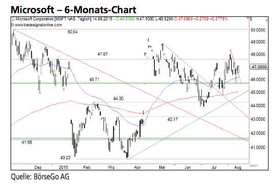Mit einem bullishen Doppelboden knapp oberhalbder 40,00 USD-Marke beendete die Käuferseite im April einen mittelfristigen Abwärtstrend, der die Aktien von Microsoft nach einem Verlaufshoch bei 50,04 USD im November 2014 erfasst hatte.