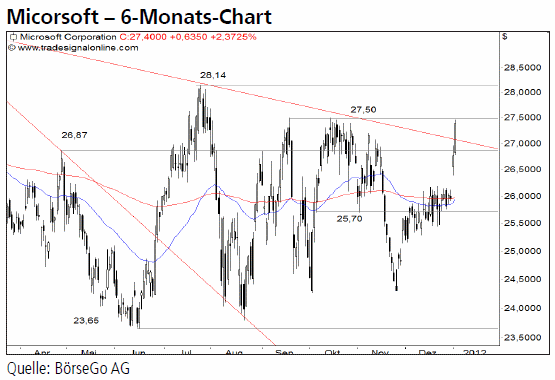 Ausblick: Der Kursbereich von 23,65 bis 24,00 USD hielt bereits mehrfach aufkommendem Verkaufsdruck stand und liess die Aktien stets von diesem Niveau nach oben hin abprallen. Der seit Dezember laufende Aufwärtsimpuls nähert sich dem Widerstandsniveau von 27,50 USD. Der Anstieg über die Abwärtstrendlinie signalisiert bereits Kaufinteresse. Die Long-Szenarien: Die Aktie könnte mit einem Sprung über die Marke von 27,50 USD ein klares Kaufsignal auslösen. Diesen Ausbruch könnte man „long“ handeln, um den nachfolgenden Aufwärtsschub bis 28,14 und darüber bis 29,50 USD gewinnbringend zu nutzen. Im Weiteren wären Kurszuwächse bis zum Niveau vom April 2010 bei 31,58 USD denkbar. Die Short- Szenarien: Können die Aktien hingegen keinen Ausbruch über 27,50 USD vollziehen und sinken stattdessen unter das Niveau von 25,70 USD zurück, sollten anschliessende Verluste bis in den bereits mehrfach getesteten Unterstützungsbereich von 23,65 bis 24,00 USD nicht überraschen. Dort besteht für die Aktien einerseits die Chance einer erneuten Aufwärtsbewegung, andererseits könnte ein Bruch der Unterstützung auch stärkere Rückschläge bis unter 20,00 USD nach sich ziehen.