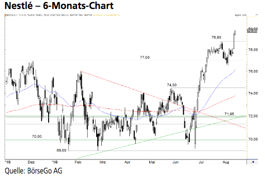 Zuletzt kam es im Juni jedoch zu einem leichten Bruch der langfristigen Aufwärtstrendlinie, was einen Test der Unterstützung bei 69,00 CHF zur Folge hatte. Davon ausgehend konnte der Wert sich steil nach oben absetzen und auch über die Barriere bei 77,00 CHF ausbrechen. Es konnte ein neues Rekordhoch bei 78,80 CHF markiert werden, ehe eine Konsolidierung des starken Anstieges eingeleitet wurde. Bereits im Bereich der Ausbruchsmarke bei 77,00 CHF setzte sich die Käuferseite durch und führte die Aktien von Nestlé auf ein neues Hoch.