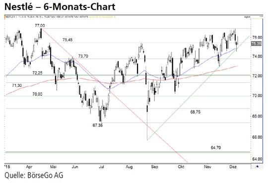 Rückblick: Im April dieses Jahres markierte das Erreichen eines neuen Allzeithochs bei 77,00 CHF den Höhepunkt einer mittelfristigen Aufwärtsbewegung bei den Aktien von Nestlé.