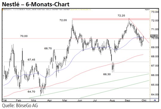 Rückblick: Der Kursverlauf der Aktien von Nestlé war in den vergangenen Monaten von einer relativ schwankungsreichen Aufwärtsbewegung geprägt, innerhalb derer es den Bullen Anfang Mai gelang, den Widerstand bei 68,75 CHF nach oben zu durchbrechen.
