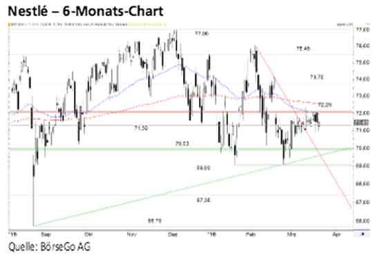 Die Short-Szenarien: Scheitert die Käuferseite dagegen an der Hürde bei 72,25 CHF, würden die Unterstützungen bei 70,00 und 69,00 CHF ein weiteres Mal von den Bären attackiert. Diese Kurszone sollte allerdings verteidigt werden und ein neuerlicher Anstieg folgen. Brechen die Aktien von Nestlé dagegen nachhaltig unter die 69,00 CHF-Marke ein, wäre ein starkes Verkaufssignal aktiviert. In der Folge dürfte der Wert bis 67,35 CHF und mittelfristig bis an die 64,70 CHF-Marke ausverkauft werden.