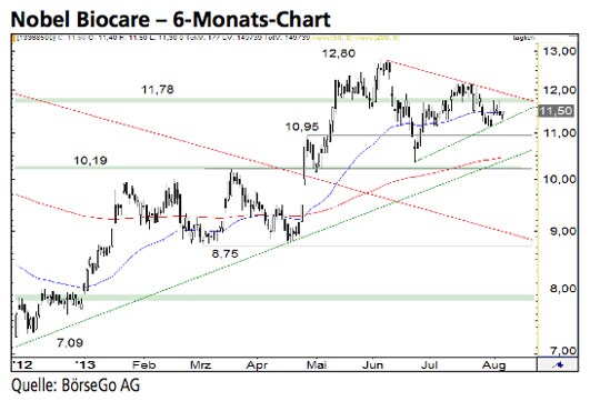 Grundsätzlich ist die charttechnische Ausgangssituation bei den Aktien von Nobel Biocare aus unserer Sicht bullish zu werten. Daran würde zunächst auch ein weiterer Rücksetzer nur wenig ändern. Die Long-Szenarien: Kann der Wert über den kleinen Widerstand bei 11,78 CHF ausbrechen, würde bereits die obere Begrenzungslinie des Dreiecks attackiert. Ein anschliessender Kaufimpuls über die 12,00 CHF- Marke würde die Konsolidierungsphase endgültig beenden können und zu einem Anstieg bis 12,80 CHF führen. Sollte das aktuelle Jahreshoch ebenfalls durchbrochen werden, könnten die Aktien zügig bis 13,56 CHF haussieren. An dieser Stelle wäre mit einer kurzfristigen Korrekturphase zu rechnen. Würde auch diese Barriere überschritten, könnte sich die Rally bis 15,26 CHF fortsetzen. Die Short-Szenarien: Ein Ausverkauf unter die Haltemarke bei 10,95 CHF würde zwar zum Bruch der Formation und einer Ausweitung der Korrektur führen. Allerdings wäre bereits auf dem Niveau der Unterstützung bei 10,19 CHF mit einer weiteren mittelfristigen Aufwärtsbewegung zu rechnen. Sollte diese Marke dem Ansturm der Bären dagegen nicht Stand halten, wäre ein Verkaufssignal aktiv. In der Folge könnte der Wert bis 8,75 CHF einbrechen, ehe dort eine Erholung wahrscheinlich werden würde.