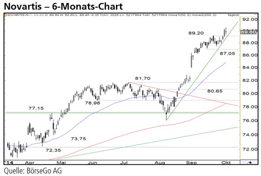 Ausblick: Der Aufwärtstrend der Aktien von Novartis ist in einem Bereich angekommen, an dem jederzeit mit einer stärkeren Korrektur zu rechnen ist. Ein Ausbruch über das gestrige Hoch könnte jedoch einen sofortigen weiteren Kurssprung auslösen. Die Long-Szenarien: Sollten die Bullen den Wert oberhalb von 89,20 CHF stabilisieren können, dürfte sich der laufende Kaufimpuls fortsetzen. Oberhalb von 90,60 CHF wäre mit einem steilen Anstieg bis 93,00 und 96,00 CHF zu rechnen. Auf diesem Niveau könnte es zu Gewinnmitnahmen und einer leichten Korrektur kommen. Würde das rechnerische Ziel bei 96,00 CHF dagegen überwunden, stünde als nächstes die 100,00 CHF-Marke auf der Agenda. Die Short- Szenarien: Abgaben unter 89,20 CHF hätten dagegen einen Test der Unterstützung bei 87,05 CHF zur Folge. Ausgehend von dieser Marke dürfte sich der Aufwärtstrend jedoch fortsetzen. Brechen die Aktien dagegen unter dieses Kursniveau ein, wäre der Anstieg der letzten Wochen gefährdet und ein Rücklauf an das frühere Hoch bei 81,70 CHF denkbar. Dort sollte sich der Wert wieder stabilisieren.