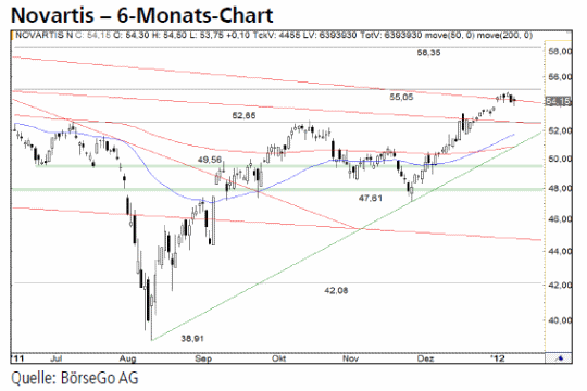 Ausblick: Kurzfristige Korrekturen sollten nicht über den Aufwärtsdrang der Aktien hinwegtäuschen. Aus unserer Sicht sind die Novartis Aktien ein klarer Kandidat für weitere Zugewinne. Die Long-Szenarien: Oberhalb von 52,65 CHF ist in den kommenden Tagen mit einer direkten Fortsetzung des Aufwärtstrends zu rechnen. Dieser sollte den Wert bei einem Anstieg über 55,05 CHF zunächst bis 57,00 und 58,35 CHF führen. Bei einem Bruch dieser Hürde stünde der Weg bis zum langfristig wichtigen Widerstandsniveau bei 64,00 CHF frei. Darüber läge das nächste Ziel bei 66,00 CHF. Entsprechend könnte man einen Ausbruch über 55,05 CHF auf Tagesschlusskursbasis „long“ handeln. Die Short-Szenarien: Sollte der Ausbruch über diesen Widerstand im ersten Anlauf nicht gelingen, dürfte es zunächst zu einem Rücksetzer bis 52,65 CHF kommen. Von dort aus könnte jedoch bereits die nächste Kaufwelle starten. Auch ein Unterschreiten dieser Marke wäre nach unserer Einschätzung zunächst unbedenklich und hätte eine Fortführung der Korrektur bis 49,56 CHF zur Folge. Als bearish wäre aktuell ohnehin erst der Bruch der markanten Unterstützung bei 47,61 CHF zu werten.