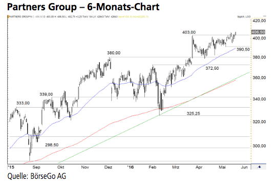 Rückblick: Die Aktien von Partners Group befinden sich in einem langfristigen Aufwärtstrend, der den Wert von einem Hoch zum nächsten befördert. Ende des vergangenen Jahres wurde im Rahmen dieser Hausse die 380,00 CHF-Marke erreicht.