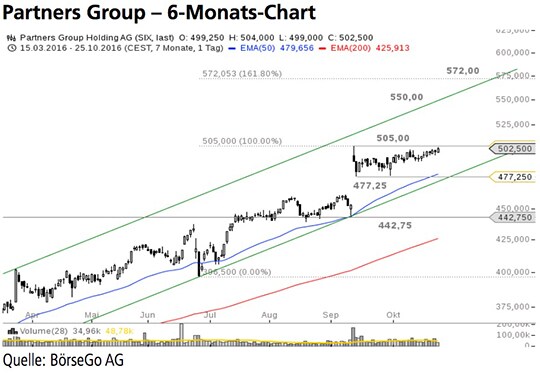 Schaut man sich den Chart der Aktien der Partners Group an, könnte man den Begriff der relativen Stärke hier gleich mehrfach unterstreichen. Völlig losgelöst vom Trend am Schweizer Aktienmarkt erklimmt der Titel nahezu täglich neue Hochs. Mit dem Ausbruch über den Widerstand bei 438,00 CHF generierte Partners Group im Juli ein Kaufsignal. Mitte September brach der Wert eine sich andeutende bearishe Verkeilung im Chart nach oben auf, was einem weiteren starken Kaufsignal gleichkam. Seit einigen Tagen konsolidieren die Aktien unter der Marke von 505,00 CHF seitwärts.