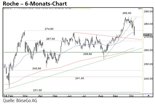 Über Monate hinweg oszillierte der Wert in einer Seitwärtsbewegung oberhalb der Unterstützung bei 258,60 CHF. Erst deren kurzzeitiger Bruch rüttelte die Käuferseite wach und sorgte für einen dynamischen Gegenangriff der Bullen. In einer massiven Kaufwelle überschritten die Aktien die Widerstände bei 267,00 und 270,00 CHF. Schliesslich überwand der Wert Anfang September auch die bisherige Rekordmarke bei 274,80 CHF und haussierte auf ein neues Allzeithoch von 285,50 CHF. Auf diesem Niveau bildete sich allerdings eine kleine bearishe Schulter-Kopf-Schulter-Formation aus, die den Ansturm der Käufer abbremste. In den vergangenen Tagen entwickelte sich aus dieser Korrektur eine deutliche Abwärtsbewegung, die die Aktien aktuell wieder unter das frühere Allzeithoch einbrechen liess.