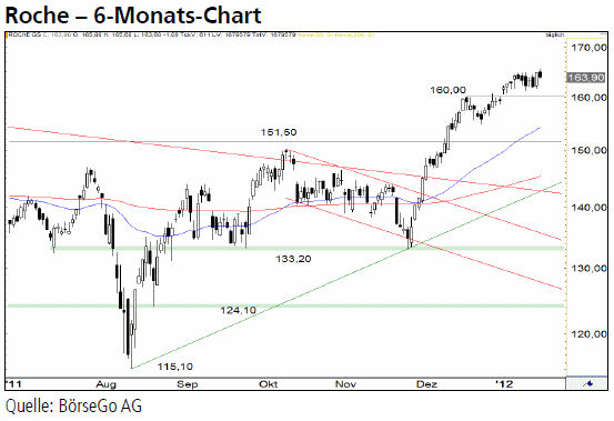 Ausblick: Die Bullen haben die Aktien von Roche weiter fest im Griff, doch sollten temporäre Korrekturen nach diesem steilen Anstieg nicht ausgeschlossen werden. Die Long-Szenarien: Können die Aktien auch die Zielmarke von 166,70 CHF durchbrechen, sollte sich der fulminante Aufwärtstrend bis 172,00 CHF und darüber bis 177,00 CHF fortsetzen. An dieser Stelle wäre mit einer ersten grösseren Korrektur zu rechnen. In der Folge dürfte sich der Aufwärtstrend jedoch weiter fortsetzen und zu einem Anstieg an das Hoch aus dem Jahr 2010 bei 187,40 CHF führen. Die Short-Szenarien: Oberhalb der Unterstützungszone von 160,00 bis 161,20 CHF ist der Wert in einem klaren Aufwärtstrend und die angesprochene Rallybeschleunigung nicht auszuschliessen. Erst ein Unterschreiten dieser Unterstützung auf Tagesschlusskursbasis dürfte aus unserer Sicht zu einem Abbremsen der Aufwärtsdynamik führen. In diesem Fall wäre ein Rücklauf an die gebrochene langfristige Abwärtstrendlinie auf Höhe von 151,50 CHF wahrscheinlich. Doch von dieser Marke könnte sich der Aufwärtstrend erneut mit einer deutlichen Aufwärtsbewegung fortsetzen. Sollten die Aktien von Roche dagegen unter diese wichtige Unterstützung zurückfallen, dürften Abgaben bis 145,00 und 140,00 CHF belasten. Diesen vorübergehenden Ausverkauf könnte man entsprechend „short“ handeln.