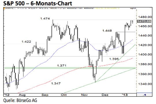 Rückblick: Seit Ende November 2012 stieg der S&P 500 Index in einer steilen Kaufwelle an und erreichte Mitte Dezember den Widerstand bei 1.448 Punkten. Nach einer...