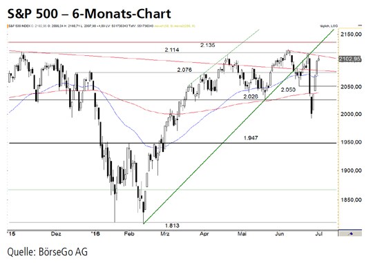 Ausblick: Der unterhalb der 2.026 Punkte-Marke ausgebildete Fehlausbruch und der anschliessende Konter der Käuferseite kann für den S&P 500 Index günstig bewertet werden und könnte eine Rally einleiten. Die Notierungen stehen aber bereits wieder in der Nähe starker Widerstände. Die Long- Szenarien: Auf der Oberseite wird es eng, neue Kaufsignale sind aber durchaus noch möglich. Bereits ein Anstieg über die 2.114 Punkte-Marke und damit ein Ausbruch aus dem Korrekturtrend der Vorwochen, würde die Chance bieten, die 2.135 Punkte-Marke zu erreichen. Auch übergeordnet würde dies für ein grösseres Kaufsignal sprechen, welches oberhalb der 2.135 Punkte-Marke den Weg über die 2.200 Punkte-Marke hinaus öffnen könnte. Die Short-Szenarien: Unterhalb der 2.114 Punkte-Marke könnte der Index jederzeit wieder nach unten drehen, wobei eine Korrektur bis zur 2.050 Punkte-Marke noch als relativ neutral gesehen werden kann. Darunter könnten jedoch stärkere Abgaben drohen, welche unterhalb der 2.026 Punkte-Marke auch ein Doppelhoch aktivieren würden. In diesem Fall müsste einkalkuliert werden, dass eine grössere Verkaufswelle bis zur 1.947 Punkte-Marke auftreten kann.