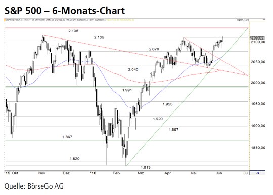Rückblick: Seit Mitte Februar befindet sich der S&P 500 Index in einer dynamischen Aufwärtsbewegung, die erst an der Widerstandsmarke bei 2.105 Punkten im April abgebremst wurde.