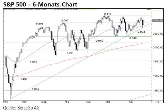 Ausblick: Der Einbruch der Vorwoche spricht zwar für den Fortbestand des volatilen Seitwärtsmarktes. Doch zeigte der gestrige Handelsverlauf, dass die Bullen das Feld nicht kampflos räumen werden. Die Long-Szenarien: Solange die Trendlinie nicht unterschritten ist, haben die Bullen zumindest im kurzfristigen Zeitfenster das Heft in der Hand. Ausgehend von 2.093 Punkten könnte es jetzt also zu einer Aufwärtsbewegung bis an das Hoch der Vorwoche bei 2.111 Punkten kommen. Ein Anstieg über die Marke sollte wieder neue Kräfte bei den Käufern freisetzen. In diesem Fall könnte eine Aufwärtswelle bis an die Rekordmarke bei 2.119 Punkten führen. Auf diesem Niveau müsste man sich allerdings auf eine weitere deutliche Gegenbewegung einstellen. Die Short-Szenarien: Wird die markante Kreuzunterstützung bei 2.079 Punkten dagegen durchbrochen, wäre dies ein Signal für die Fortsetzung der Abwärtsbewegung. In der Folge dürfte auch die Haltemarke bei 2.064 Punkten dem Ansturm der Bären nicht standhalten. Vielmehr ist davon auszugehen, dass dies einen scharfen Ausverkauf bis an die solide Unterstützung bei 2.040 Punkten nach sich ziehen dürfte.