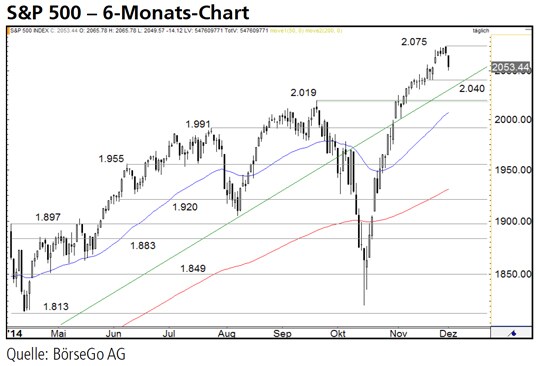 Ausblick: Von einer Korrekturphase zu sprechen, scheint nach den massiven Anstiegen der letzten Zeit verfrüht. Dennoch stand die letzte Woche im Zeichen einer Abschwächung der Aufwärtsdynamik, die sich weiter fortsetzen kann. Die Long- Szenarien: Verbleibt der S&P 500 jetzt unter der 2.065 Punkte- Marke, könnte dies der Startschuss für eine leichte Gegenbewegung bis 2.040 Punkte sein. An dieser Stelle sollte sich der Wert jedoch wieder erholen und dynamisch in Richtung des Rekordhochs ansteigen. Bricht der Index anschliessend über die 2.075 Punkte-Marke aus, käme es zu einer Kaufwelle an das rechnerische Kursziel bei 2.095 Punkten. Wird auch dieser Zielbereich überschritten, könnte der Wert mittelfristig bereits bis 2.120 Punkte klettern. Die Short-Szenarien: Ein Ausverkauf unter die 2.040 Punkte-Marke würde dagegen zu einer Korrektur an das frühere Allzeithoch bei 2.019 Punkten führen. Dieses Niveau sollten die Käufer jedoch wiederum zum Einstieg und zur Fortsetzung der übergeordneten Aufwärtsbewegung nutzen. Kann diese Unterstützung dagegen nicht verteidigt werden, stünde eine Ausweitung der Korrekturbewegung bis an die Haltemarke bei 1.991 Punkten auf der Agenda.