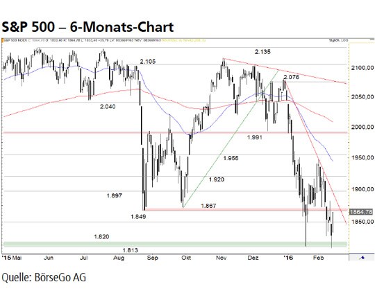 Rückblick: Im Rahmen seiner massiven Abwärtsbewegung brach der S&P 500 Index Mitte Januar unter die wichtige Unterstützung bei 1.867 Punkten ein und markierte mit 1.813 Punkten ein neues Verlaufstief.