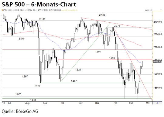 Rückblick: Nachdem der S&P 500 Index Mitte Februar zum zweiten Mal innerhalb eines Monats an die wichtige langfristige Unterstützung bei 1.813 Punkten eingebrochen war, startete dort ein Gegenschlag der Bullen.