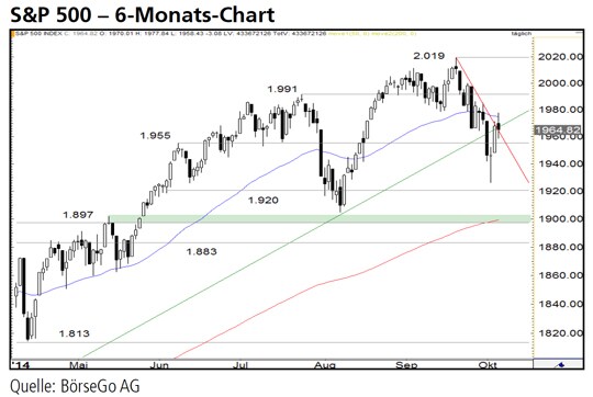 Rückblick: Der korrektive Rückgang seit dem neuen Allzeithoch bei 2.019 Punkten führte den S&P 500 Index seit Mitte September unter die Unterstützungen bei 1.991 und 1.975 Punkten.
