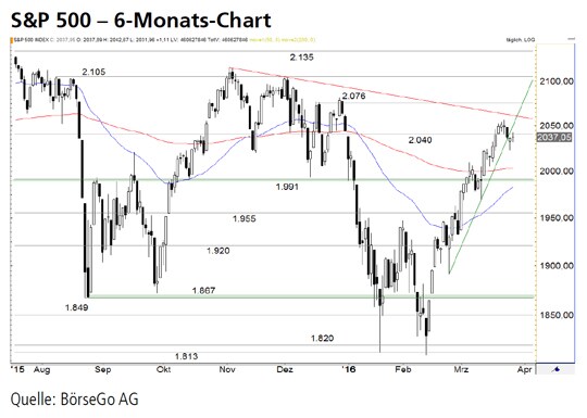 Rückblick: Nach dem Anstieg über den Widerstand bei 1.991 Punkten Anfang März erreichte der S&P 500 Index in der vergangenen Woche die anvisierte kurzfristige Zielregion bei 2.055 Punkten.