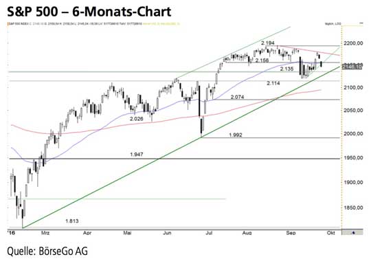 Der Mitte Juli über die 2.135 Punkte-Marke im S&P 500 Index erfolgte Kursausbruch führte den Index zunächst bis auf ein Rekordhoch bei 2.194 Punkten, bevor die Rally ab Mitte August wieder in einer hohen Seitwärtsbewegung konsolidiert wurde.