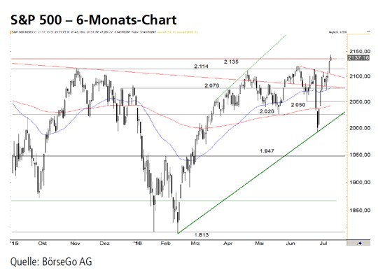 Rückblick: Vor dem Brexit-Referendum startete der S&P 500 Index zu einem Ausbruchsversuch über die bei 2.114 Punkten liegende Widerstandsmarke, musste jedoch nach dem Referendum stark abgeben.