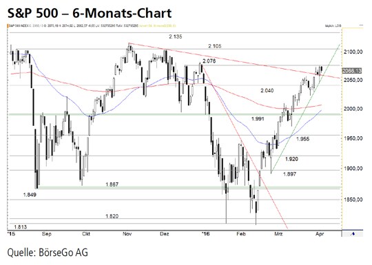 Rückblick: Seit dem Ausbruch über die 1.955 Punkte-Marke und der damit erfolgten Aktivierung eines bullishen Doppelbodens zieht der S&P 500 in einer steilen Aufwärtsbewegung in Richtung seines Allzeithochs bei 2.135 Punkten an.