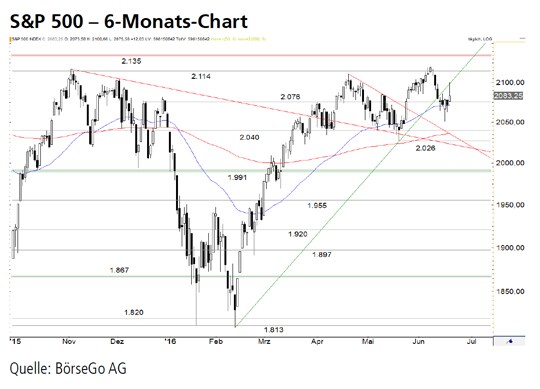 Ausblick: Kurzfristig muss der Bruch des Aufwärtstrends kritisch bewertet werden. Der dennoch ausbleibende Verkaufsdruck ist jedoch ein günstiges Signal für die Bullen. Die Long- Szenarien: Falls sich die Stimmung vor der Brexit-Entscheidung weiter aufhellt und der S&P 500 den Aufwärtstrend mit einem Anstieg über 2.114 Punkte zum Schlusskurs zurückerobert, bietet sich die Chance, die langfristigen Hochs bei 2.135 Punkten zu erreichen. Die seit einigen Wochen laufende Seitwärtsphase könnte den entscheidenden Schwung bieten, um auch darüber auszubrechen und in Richtung der 2.200 Punkte-Marke zu steigen. Die Short-Szenarien: Vor allem der am Montag vollzogene Rücklauf an den gebrochenen Aufwärtstrend birgt die Gefahr einer Bestätigung des Verkaufssignals. Abgaben bis zur 2.050 Punkte- Marke müssen daher weiter einkalkuliert werden. Wichtig ist aber vor allem die Unterstützung bei 2.026 Punkten. Hält diese zum Schlusskurs nicht, könnte ein stärkerer Rücklauf, auch unter die 2.000 Punkte-Marke, anstehen. Vorerst kann der Index aber relativ neutral bewertet werden.