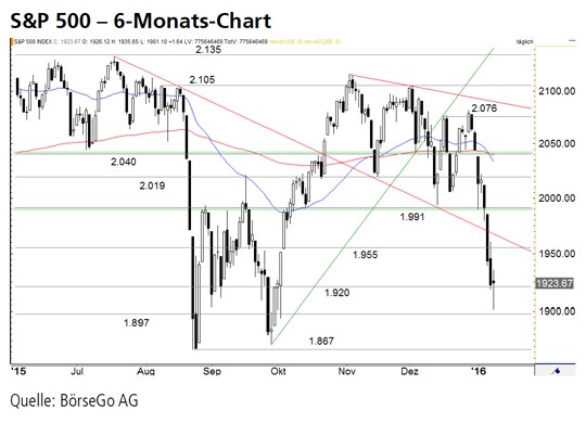 Rückblick: Nachdem der S&P 500 Index Ende Dezember an der Hürde bei 2.076 Punkten ein Doppelhoch ausgebildet hatte, brach der Wert unter die 2.040 Punkte-Marke und in der vergangenen Woche sogar unter die Unterstützung bei 1.991 Punkten ein.