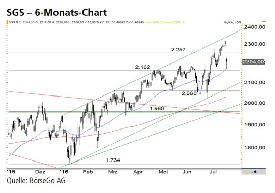 Ausblick: Der Kursverlauf hat die alte Ausbruchsmarke bei 2.162 CHF nun wieder erreicht, sodass die Rally bereits fortgesetzt werden könnte. Die Dynamik des jüngsten Rücklaufs lässt aber auch eine Ausdehnung der Konsolidierung möglich erscheinen. Die Long-Szenarien: Nach dem Rückfall auf die wichtige Unterstützung bei 2.162 CHF bietet sich bereits die Chance, die Aufwärtstendenz innerhalb des Trendkanals wieder aufzunehmen. Der Wert könnte dabei die Oberkante des Trendkanals bei derzeit 2.340 CHF erreichen, bevor hier mit einem Rücksetzer zu rechnen wäre. Falls es der Käuferseite gelingt, SGS auch über die bei 2.340 CHF liegende Trendkanaloberkante zu führen, könnte die seit dem Brexit-Referendum verschärfte Rally noch ausgedehnt werden. Kursgewinne bis zum Rekordhoch bei 2.450 CHF wären in diesem Fall möglich. Die Short-Szenarien: Bereits ein Rückfall unter die 2.162 CHF-Marke wäre kurzfristig bearish zu werten. In diesem Fall ist die Möglichkeit gegeben, den Aufwärtstrendkanal der vergangenen Monate vollständig nach unten zu durchlaufen. Die bei 2.070 CHF liegende Trendkanalunterkante sollte den Wert jedoch stützen. Kommt es darüber hinaus noch zu einer Korrektur unter die 2.060 CHF-Marke, würde dies einen Bruch des Aufwärtstrends bedeuten. In diesem Fall wäre auch eine umfassende Abwärtswelle bis zur 1.960 CHF-Marke möglich.