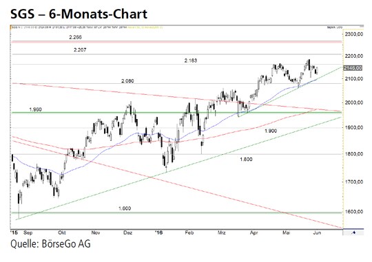 Ausblick: Die Aktien von SGS arbeiten sich Schritt für Schritt von einem Jahreshoch zum nächsten empor. Insbesondere im mittelfristigen Zeitfenster ist der Wert aus unserer Sicht weiter aussichtsreich. Die Long-Szenarien: Nach einem Rücksetzer an die Aufwärtstrendlinie auf Höhe von 2.105 CHF könnten die Käufer den Anstieg der Vorwochen fortsetzen und die Aktien von SGS wieder über die 2.163 CHF-Marke steigen lassen. Ein anschliessender Ausbruch über die Kurshürde bei 2.207 CHF könnte die Hausse beschleunigen und den Wert bis 2.266 CHF führen. Wird dieser markante Widerstand nachhaltig überwunden, wäre ein Kaufsignal aktiviert. In dessen Folge wäre ein Anstieg bis an die Barriere bei 2.361 CHF und darüber bereits bis an die 2.450 CHF-Marke möglich. Die Short-Szenarien: Setzt der Wert dagegen unter die 2.105 CHF-Marke zurück, dürfte es zu einem erneuten Test der Unterstützung bei 2.080 CHF kommen. Diese Haltemarke sollte von den Käufern verteidigt und für die Fortsetzung des Aufwärtstrends genutzt werden. Denn bei einem Unterschreiten der Marke wäre mit steigendem Abgabedruck und einer ausgeprägten Korrektur bis 1.960 und 1.900 CHF zu rechnen.