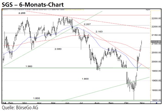 Ein Ausbruch über die Hürde misslang jedoch und der Wert geriet nach dem Bruch der steilen kurzfristigen Aufwärtstrendlinie spürbar unter Druck. Bis Anfang August brachen die Aktien erneut an die Haltemarke bei 1.960 CHF ein und wurden nach deren Unterschreiten direkt bis an die langfristige Unterstützung bei 1.800 CHF ausverkauft. Doch Mitte Oktober setzte nach der erfolgreichen Verteidigung dieser Marke ein massiver Kaufimpuls ein, der bislang anhält. In dessen Verlauf durchbrach der Wert die Hürde bei 1.900 CHF und konnte zuletzt auch die 1.960 CHFMarke zurückerobern. In der vergangenen Woche setzte sich der Konter der Bullen mit dem Überschreiten der kurzfristigen Abwärtstrendlinie und dem Wiederanstieg über den markanten Widerstand bei 2.080 CHF fort.